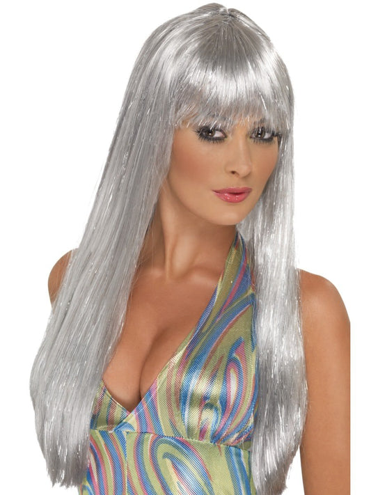 Silver 70's disco style wig with glitter strands